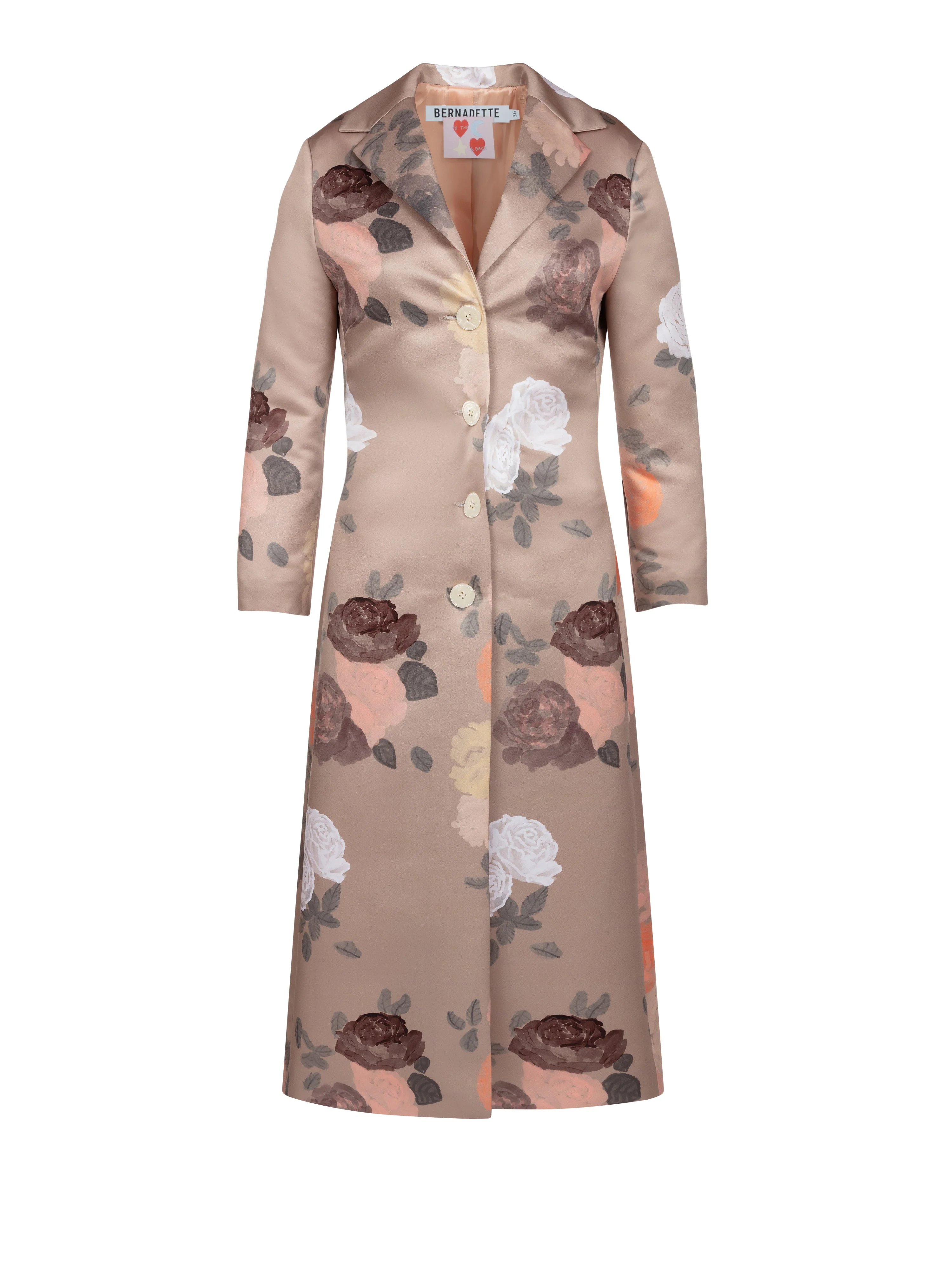 The long coat is crafted in a soft silk-satin with our hand-painted Auscot Rose motif in peach and chocolate on caramel. A timeless outer layer for the cooler months — style it on its own as a dress, or layer it over the Taylor skirt and Hunter Henley for a chic coat look. Product information Aster is 176 cm / 5’9” and wears size EU34. Coat Elle is fully lined and fits small to size. Size up if you're in between two sizes. For sizing information, please e-mail sales@bernadetteantwerp.com. Fabrics from Italy Made in Romania 100% PL / LINING: 100% VI