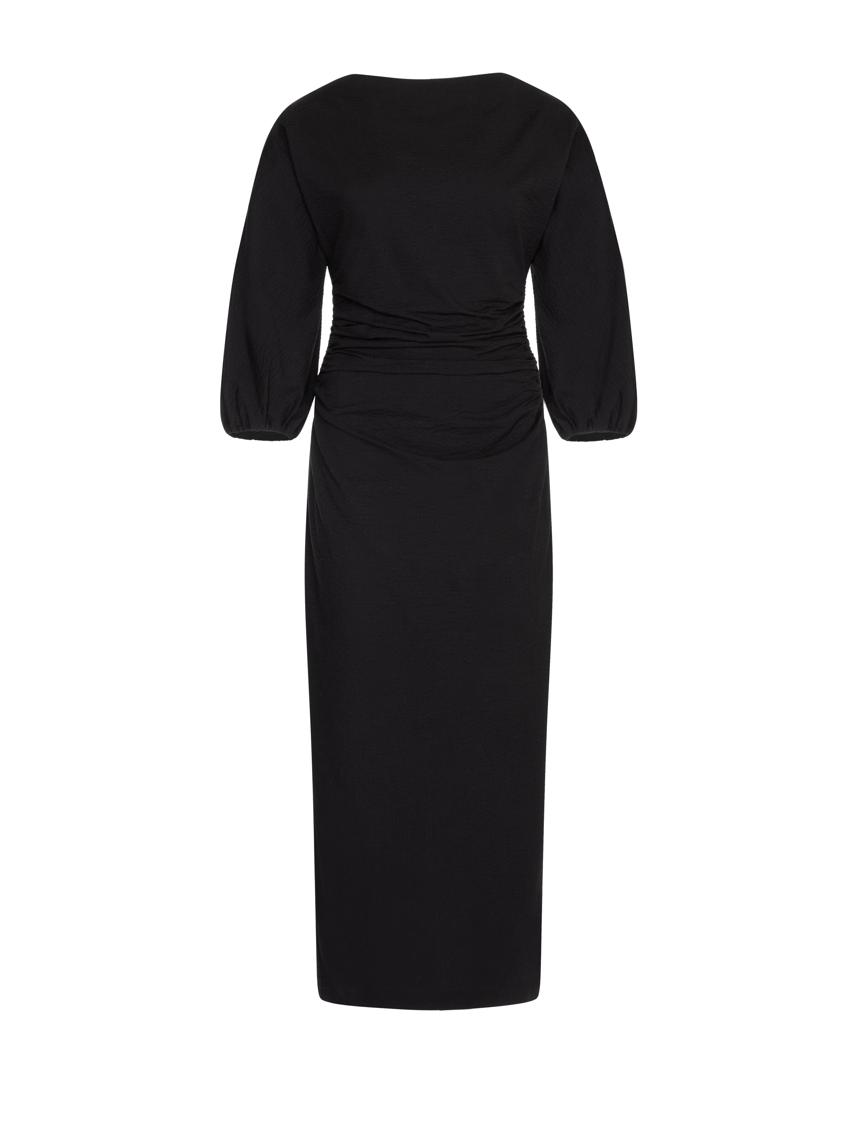 Dress Ezra — BERNADETTE's exclusive cotton seersucker style in black. With a subtle cinched waist, back slit, and elegant kimono sleeves, this dress offers a refined look. The light fabric will make this your go-to spring-summer dress. Product information Charlotte is 168cm / 5'6" and wears size EU34. Dress Ezra fits true to size. For size inquiries, e-mail sales@bernadetteantwerp.com Fabrics from Italy Made in Romania 100% CO