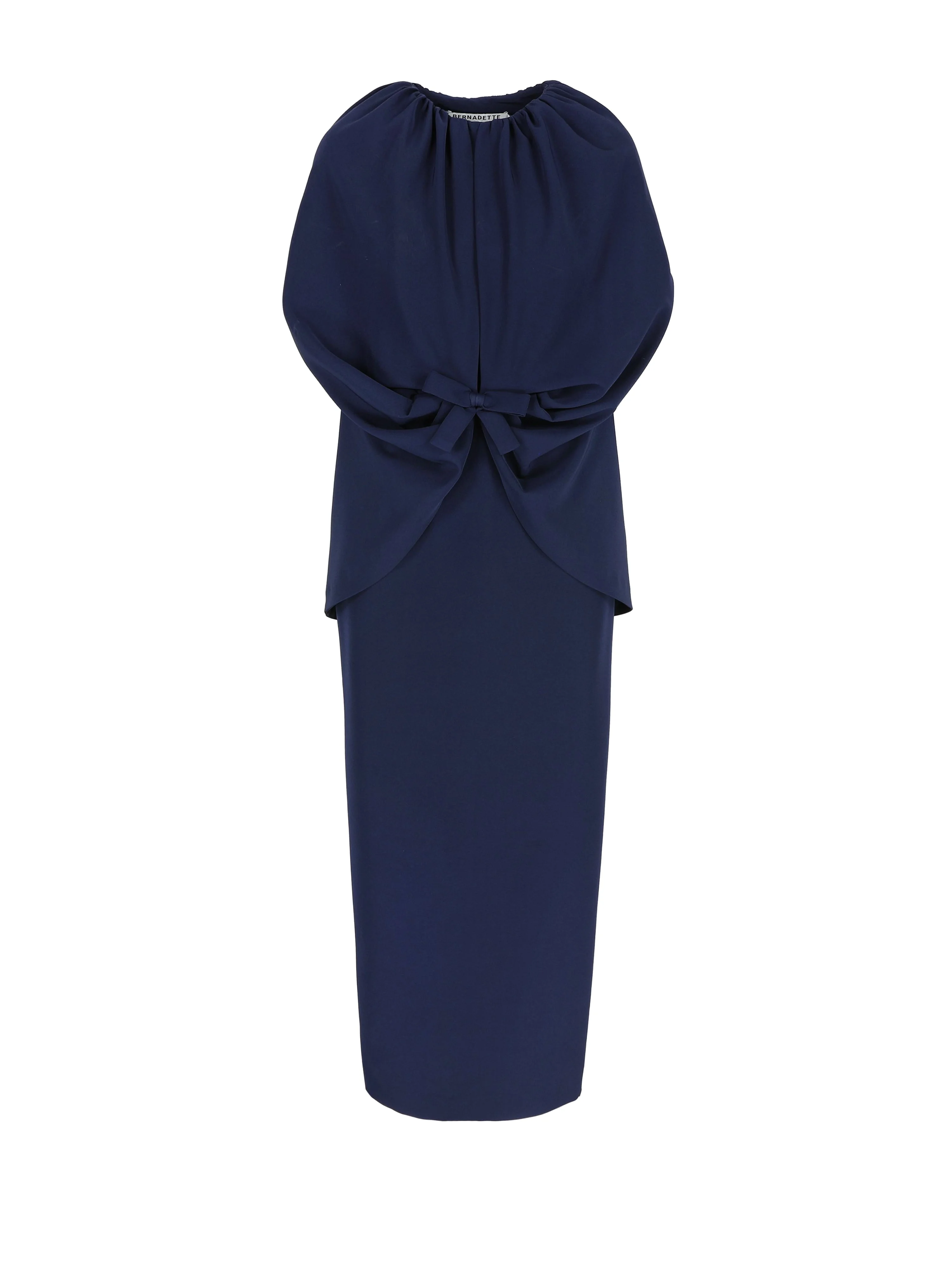 Introducing our take on pure sophistication with Dress Gislene. This midnight blue ankle-length dress features a straight silhouette, embraced by a cape that gathers in the front with our signature small bow. Having the option to either open or fully close the neckline, Gislene is designed to be worn by any woman. Product information Charlotte is 168cm / 5'6" and wears size EU34. Jools is 176cm / 5'9" and wears size EU36. Dress Gislene fits tight around the hips. If you're between two sizes, take a size up. For size inquiries, e-mail sales@bernadetteantwerp.com. Fabrics from Greece Made in Romania 95% PL 5% EA
