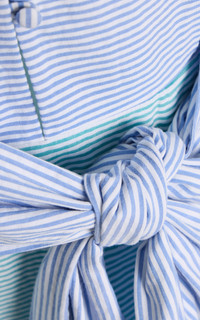 Helmed by Belgian mother-daughter duo Bernadette and Charlotte de Geyter, Bernadette is rooted in the special, delicacy-like allure of gorgeous, found vintage lingerie. Carrying an exclusive colorway, the label’s seersucker ‘Clarence’ dress has shirt detailing across the collar, an A-line skirt and BERNADETTE’s classic oversized bow. Deliver a masterclass in pastels by adding butter-yellow shoes or a pale-pink clutch. PRODUCT DETAILS - Pre-Fall '25 - Button fastening - Composition: 100% cotton - Dry clean - Imported SIZE & FIT - Our model is wearing a size FR 34 - Model is 5'10" with a 30" bust, 24" waist, and 34" hip - Designed for a regular fit
