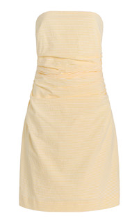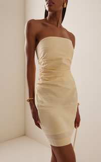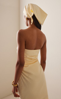 Helmed by Belgian mother-daughter duo Bernadette and Charlotte de Geyter, Bernadette is rooted in the special, delicacy-like allure of gorgeous, found vintage lingerie. Tailored with a sense of ease, BERNADETTE’s 'Vera' dress and matching bandana are delivered in an exclusive, hand-embroidered seersucker. This strapless silhouette benefits from gathers across the waistline and a close fit through the leg. Magnify the buttery hue with gold-tone jewellery. PRODUCT DETAILS - Pre-Fall ‘25 - Concealed zip fastening - Composition: 100% cotton - Dry clean - Imported SIZE & FIT - Our model is wearing a size FR 34 - Model is 5'10" with a 30" bust, 24" waist, and 34" hip