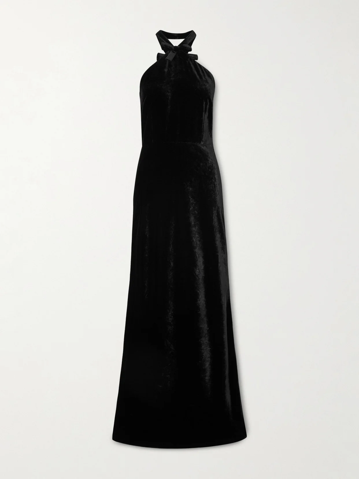 BERNADETTE's 'Jolene' maxi dress is an elegant option for evening events. It's cut from velvet that skims the body and has a halter neckline accented with a pretty bow.