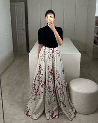 Introducing the Kennedy Skirt, a standout design in our in-house Red Berry Branch print on vanilla. With its oversized, flowing silhouette, this maxi skirt moves with ease. Pair with the Pull Noa in black for an effortless autumn look. Product information Mardiana is 174 cm / 5’9” and wears size EU36. Tumbush is 173 cm / 5’8” and wears size EU36. Skirt Kennedy fits true to size. For size inquiries, please e-mail sales@bernadetteantwerp.com Fabrics from Italy Made in Romania 100% PL