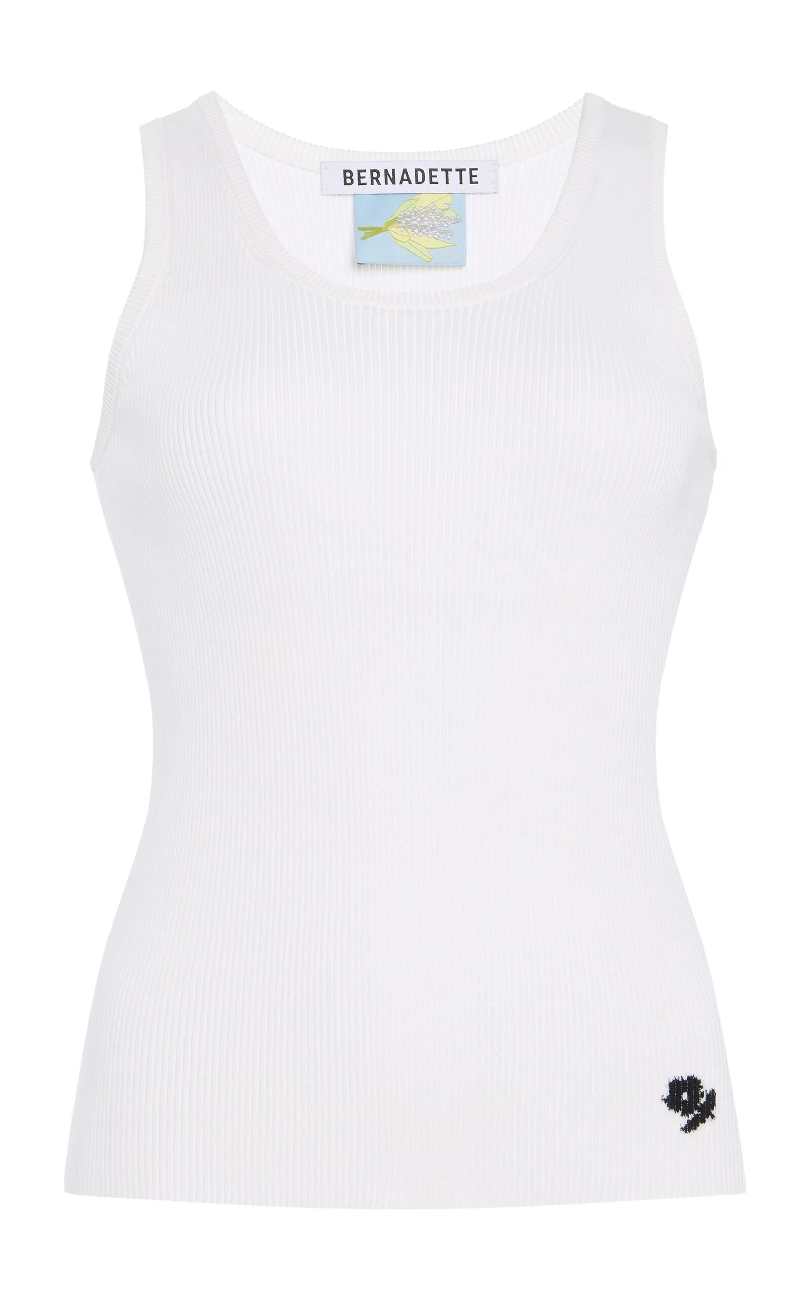 Helmed by Belgian mother-daughter duo Bernadette and Charlotte de Geyter, Bernadette is rooted in the special, delicacy-like allure of gorgeous, found vintage lingerie. A classic scoop-neck tank made from ribbed cotton jersey embroidered with a rose logo at the hem. PRODUCT DETAILS - Pre-Fall '25 - Slip on - Composition: 100% cotton - Dry clean - Imported SIZE & FIT - Our model is wearing a size FR 34 - Model is 5'10" with a 31" bust, 23.5" waist, and 33.5" hip - Designed for a slim fit