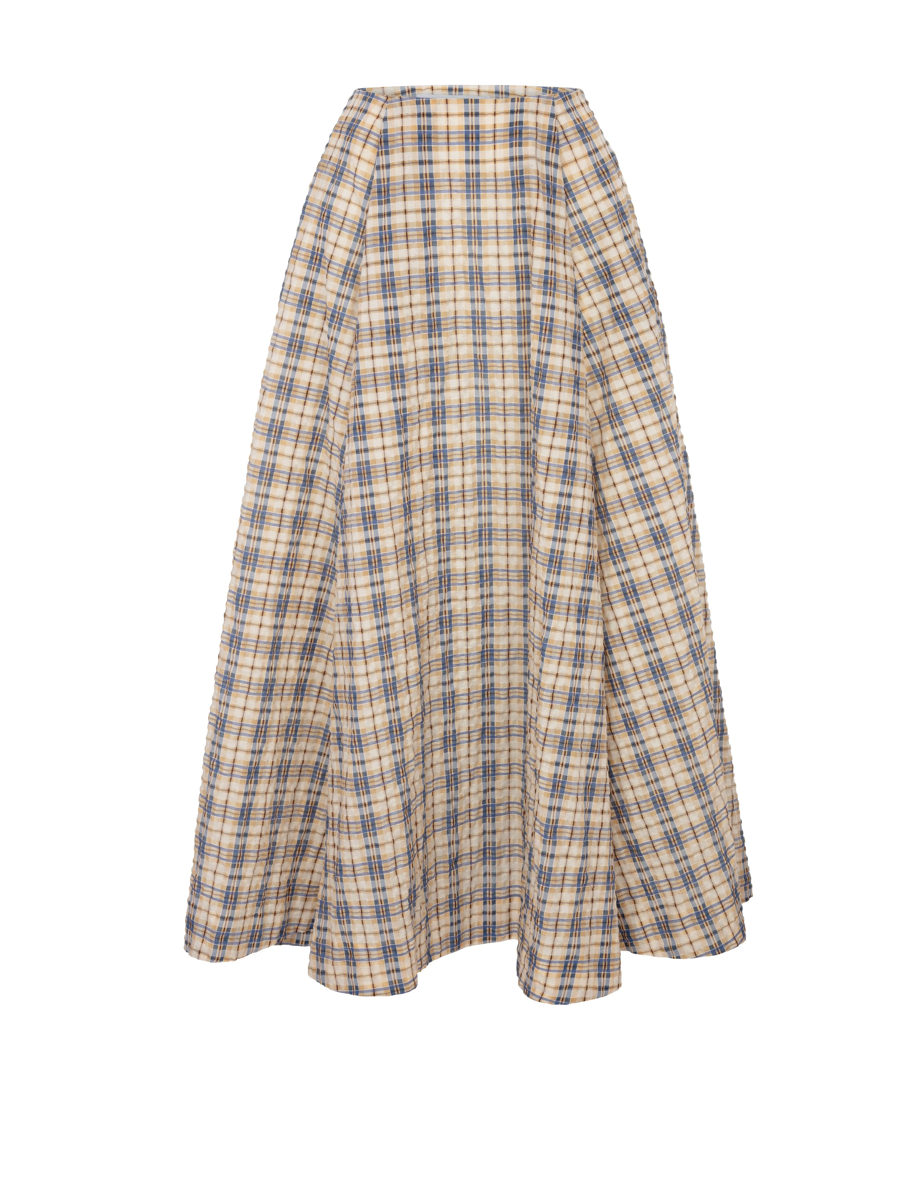 Introducing the Midi Skirt Kennedy in a blue and beige seersucker check. Crafted from a structured, substantial fabric, its wide silhouette creates a beautifully voluminous shape. A statement piece that balances texture and ease with quiet confidence. Product information Caden is 174 cm / 5’8” and wears size EU36. Midi Skirt Kennedy fits true to size. For size inquiries, please e-mail sales@bernadetteantwerp.com Fabrics from Italy Made in Romania 41% PL 30% CO 29% PA