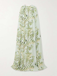 Minnie cape-effect embellished floral-print crepe de chine gown Green