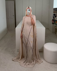 Introducing Embroidered Dress Minnie — a floor-length gown in light crepe, brought to life with our Champagne Grass embroidery on soft beige. Designed with a delicate cape that gathers at the neckline, it can be draped over the shoulders for a classic feel or left to flow for a modern statement. Product information Charlotte is 168cm / 5'6" and wears size EU34. Tumbush is 173 cm / 5’8” and wears size EU36. Dress Minnie fits true to size. We recommend taking your regular size. For sizing information, please e-mail sales@bernadetteantwerp.com. Fabrics from Greece Made and hand-embroidered in India 100% VI