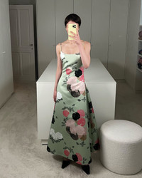 Dress Nicole makes its mark in our Auscot Rose print — painted pink and black florals on soft sage green. Crafted from a sturdy fabric with a silk-satin feel, this ankle-length gown features dainty straps and an elegant neckline. Product information Aster is 176 cm / 5’9” and wears size EU36. Dress Nicole is fully lined. If in between two sizes, size up one size. For size inquiries, e-mail sales@bernadetteantwerp.com. Fabrics from Italy Made in Romania 100% PL / LINING: 100% VI
