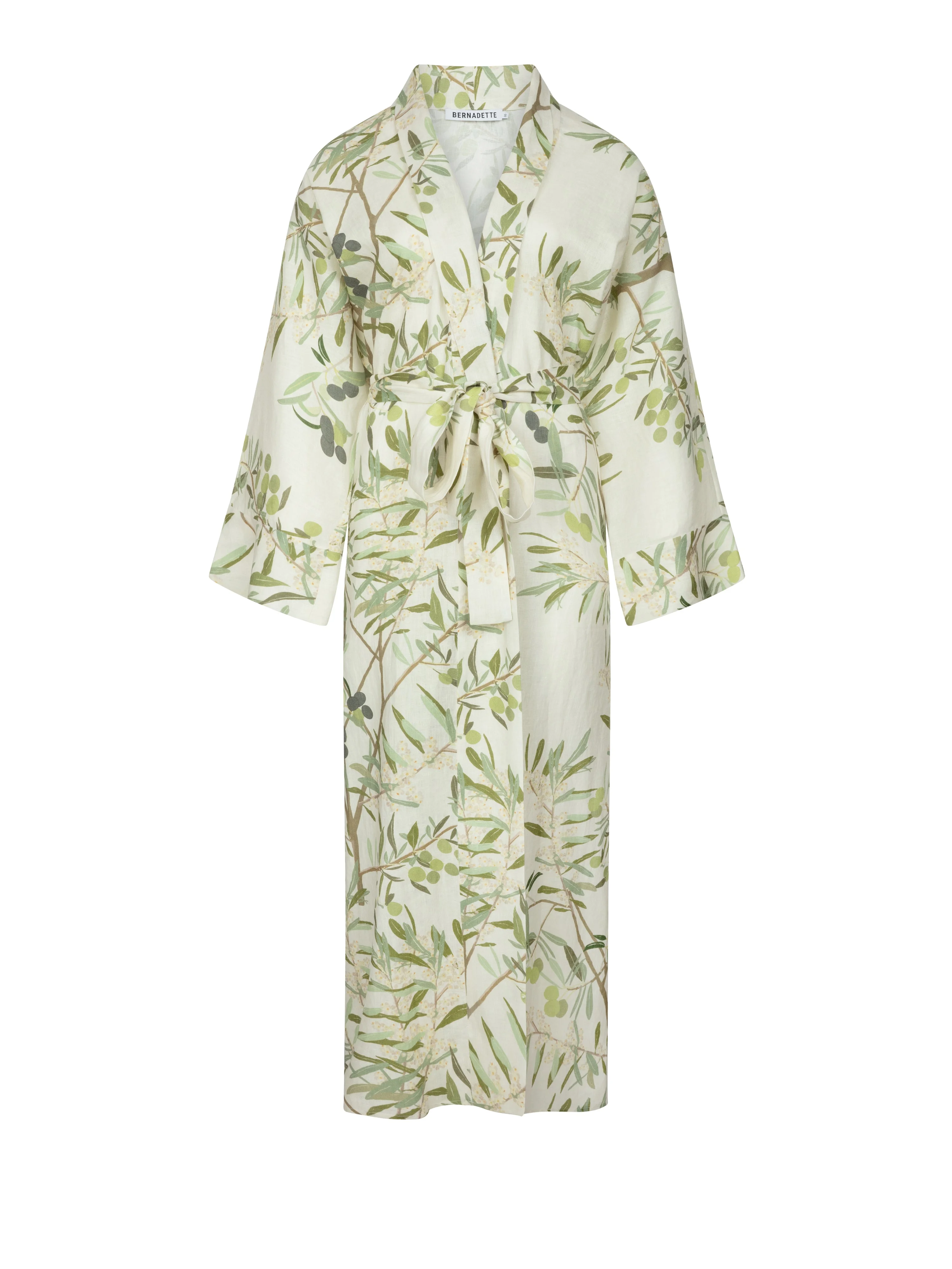 BERNADETTE brings back its most signature style, the peignoir. This one is cut from airy linen, adorned with our hand-drawn olive tree print on butter. Pair it casually with flat sandals or elevate the look with a kitten heel. Product information Charlotte is 168cm / 5'6" and wears size EU34. The peignoir in linen fits true to size and fits most sizes. For size inquiries, e-mail sales@bernadetteantwerp.com. Fabrics from Italy Made in Romania 100% LI Due to the natural qualities of linen, each piece may have subtle variations. These unique characteristics are inherent to printed linen, enhancing the individuality of every garmentCharlotte is 168cm / 5'6" and wears size EU34.