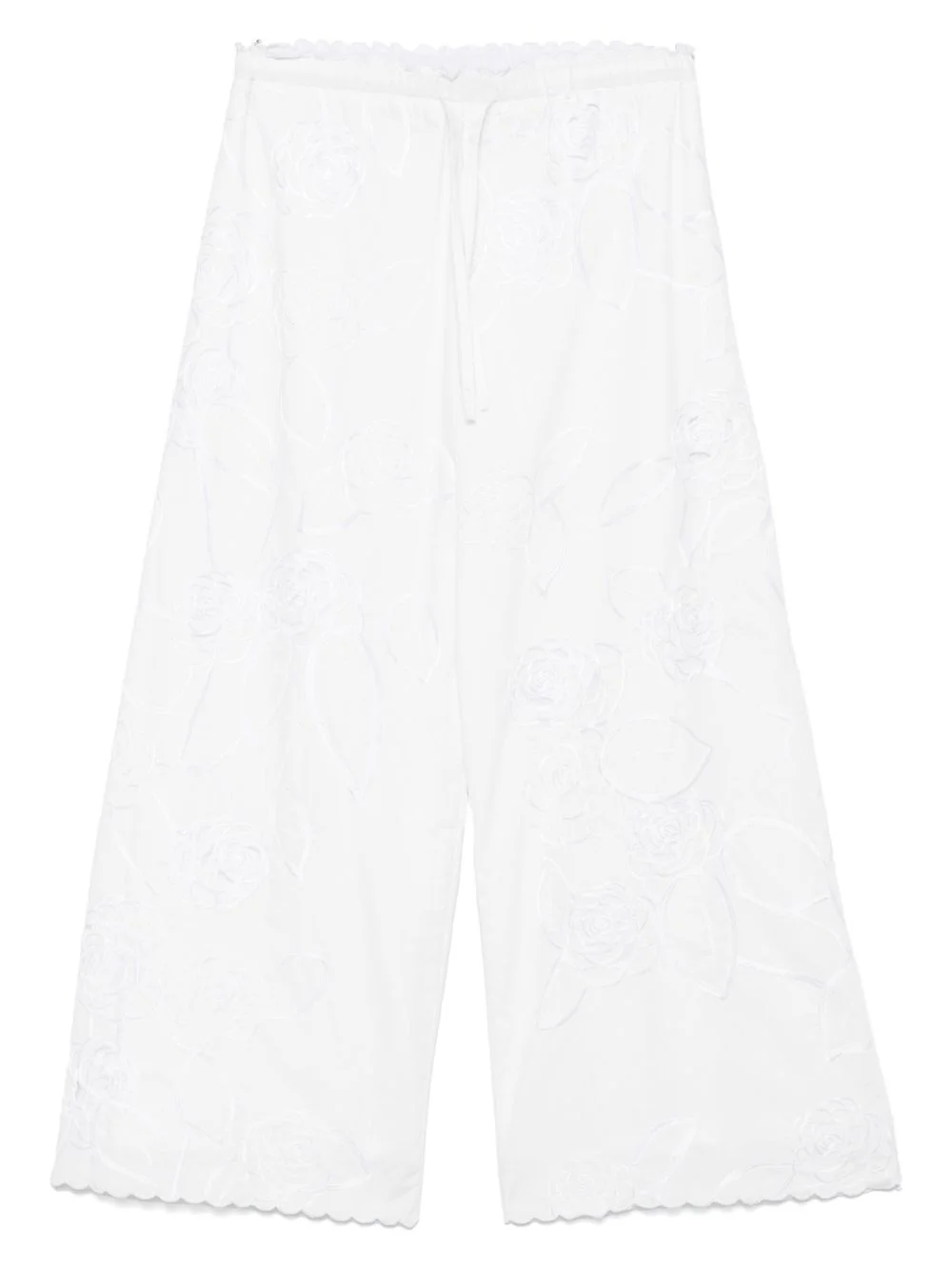 Petit Beurre-embroidered trousers Highlights - White - Elasticated drawstring waistband - Two side inset pockets - Scallop edge Imported Composition Cotton 100% SIZE & FIT Model measurements Height 5 ft 10 in(1.79 m) Bust/Chest 33.07 in(84 cm) Hips 35.82 in(91 cm) Waist 24.01 in(61 cm) FittingInformation Designed with a wide-leg cut, these trousers allow for a close fit at the waist and offer a loose and roomy fit over the leg Adjust this piece’s waistband to your preference using the drawstring Made from a midweight non-stretch fabric