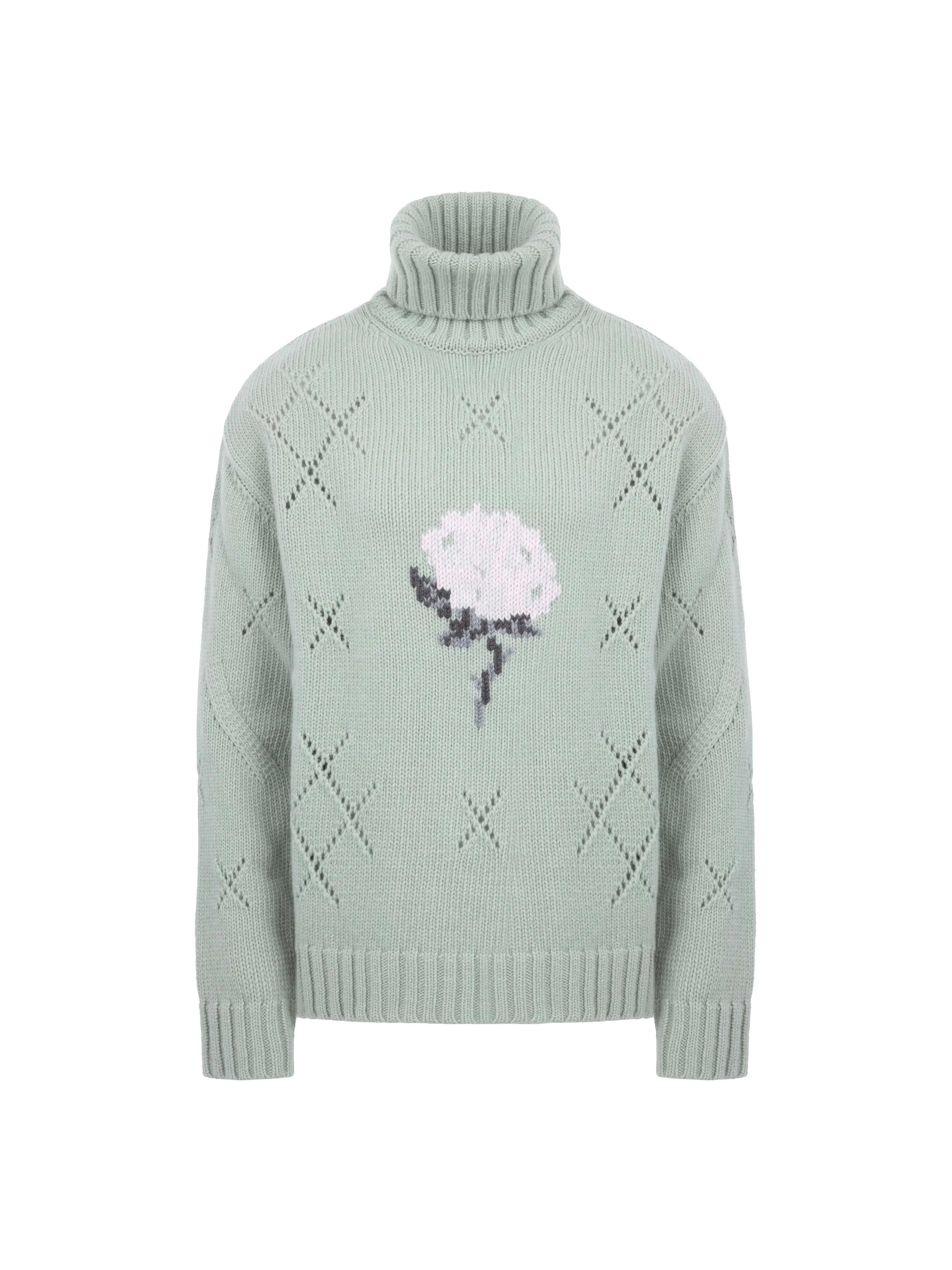 Pull Sharon is crafted in our Pink Rose Branch on Mint motif and featuring delicate pointelle details with hand-embroidered florals, it brings a fresh burst of colour to colder days. Pair with Skirt Rox in pinstripe and embroidery for a playful autumn look. Product information Charlotte is 168 cm / 5'6" and wears size XS. Pull Sharon fits true to size, and has an oversized fit. For size inquiries, e-mail sales@bernadetteantwerp.com. Yarns from Italy Made in Bulgaria 94% SUPERFINE WO 6% WV