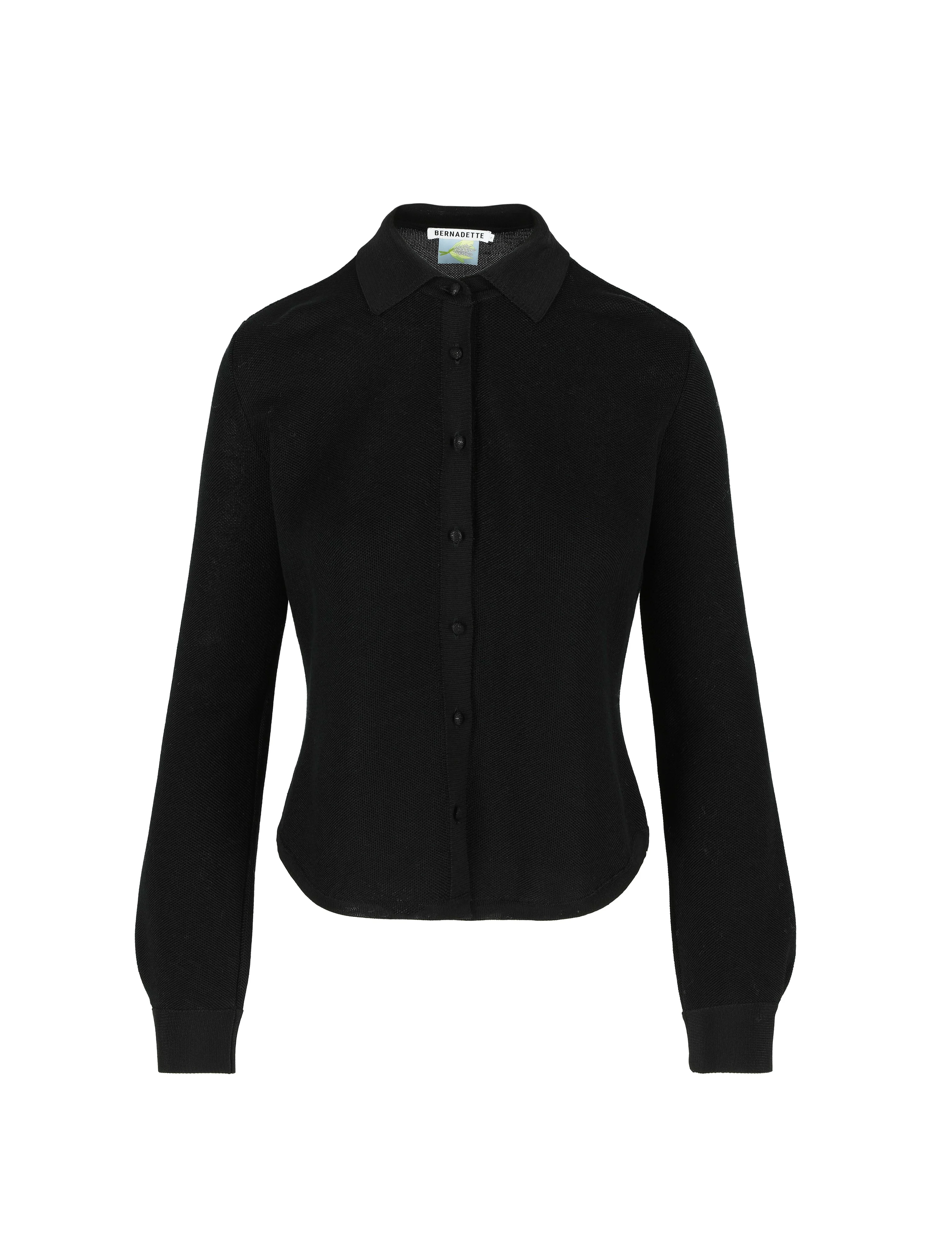 Introducing Shirt Tina, BERNADETTE's take on the classic button-up shirt, knitted from a cotton blend. Featuring matching fabric-covered front buttons in black and a delicate collar, it’s the perfect piece to pair with our hand-embroidered Skirt Miriam. Product information Mardiana is 174 cm / 5’9” and wears size S. Charlotte is 168cm / 5'6" and wears size XS. Shirt Tina fits true to size. For size inquiries, e-mail sales@bernadetteantwerp.com. Yarns from Italy Made in Bulgaria 64% VI 36% CO