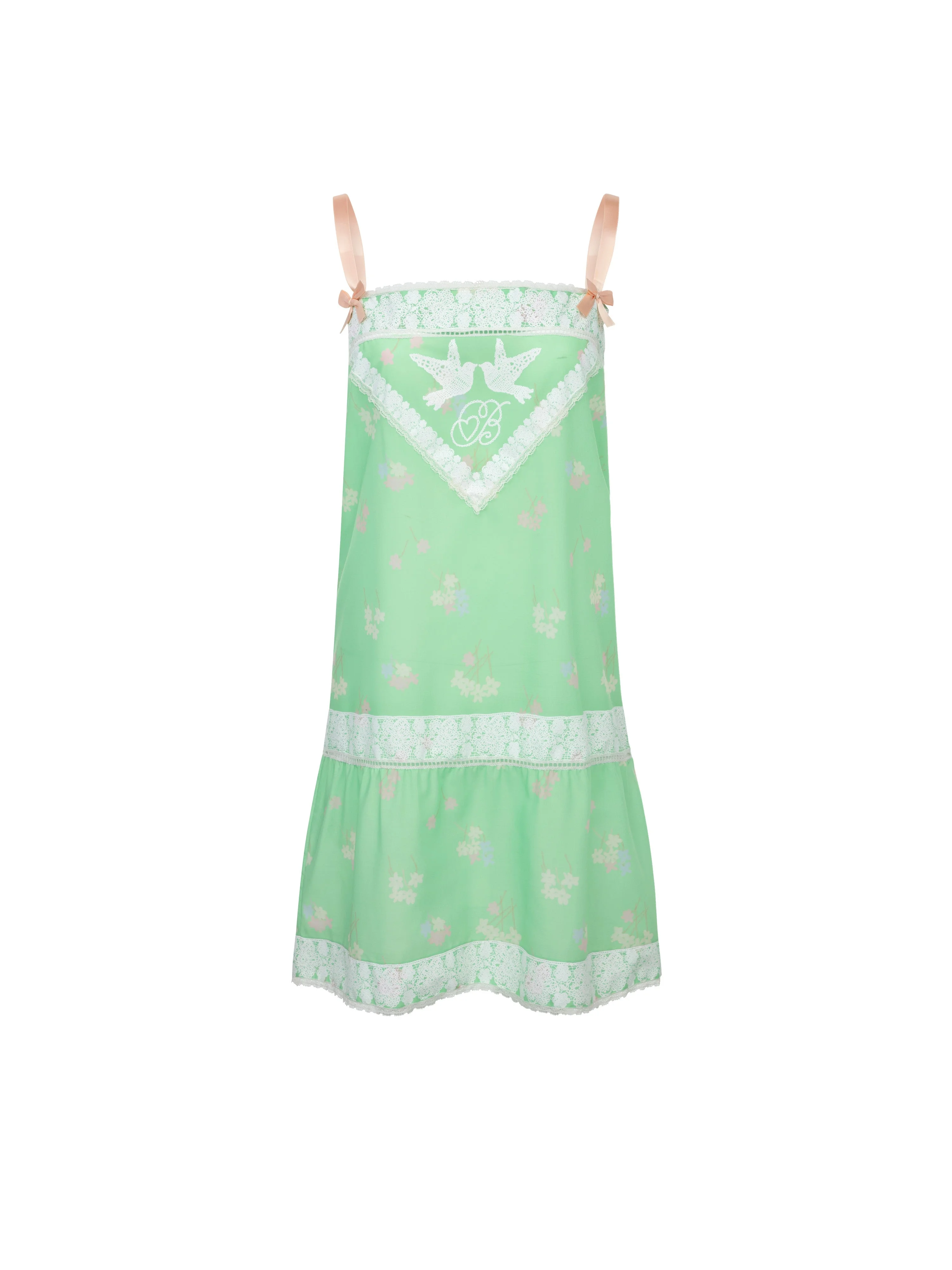 Dress Lily in mint, crafted from recycled yarn and cut just above the knee. Featuring our Small Lingerie Flower print on a soft mint base, with delicate lace inserts throughout. Finished with bow-tied straps and a straight, fluid silhouette — the breeziest summer dress. Product information Charlotte is 168cm / 5'6" and wears size EU34. Dress Lily fits true to size. For size inquiries, e-mail sales@bernadetteantwerp.com. Made in Lithuania Fabrics from Italy 100% RECYCLED PL