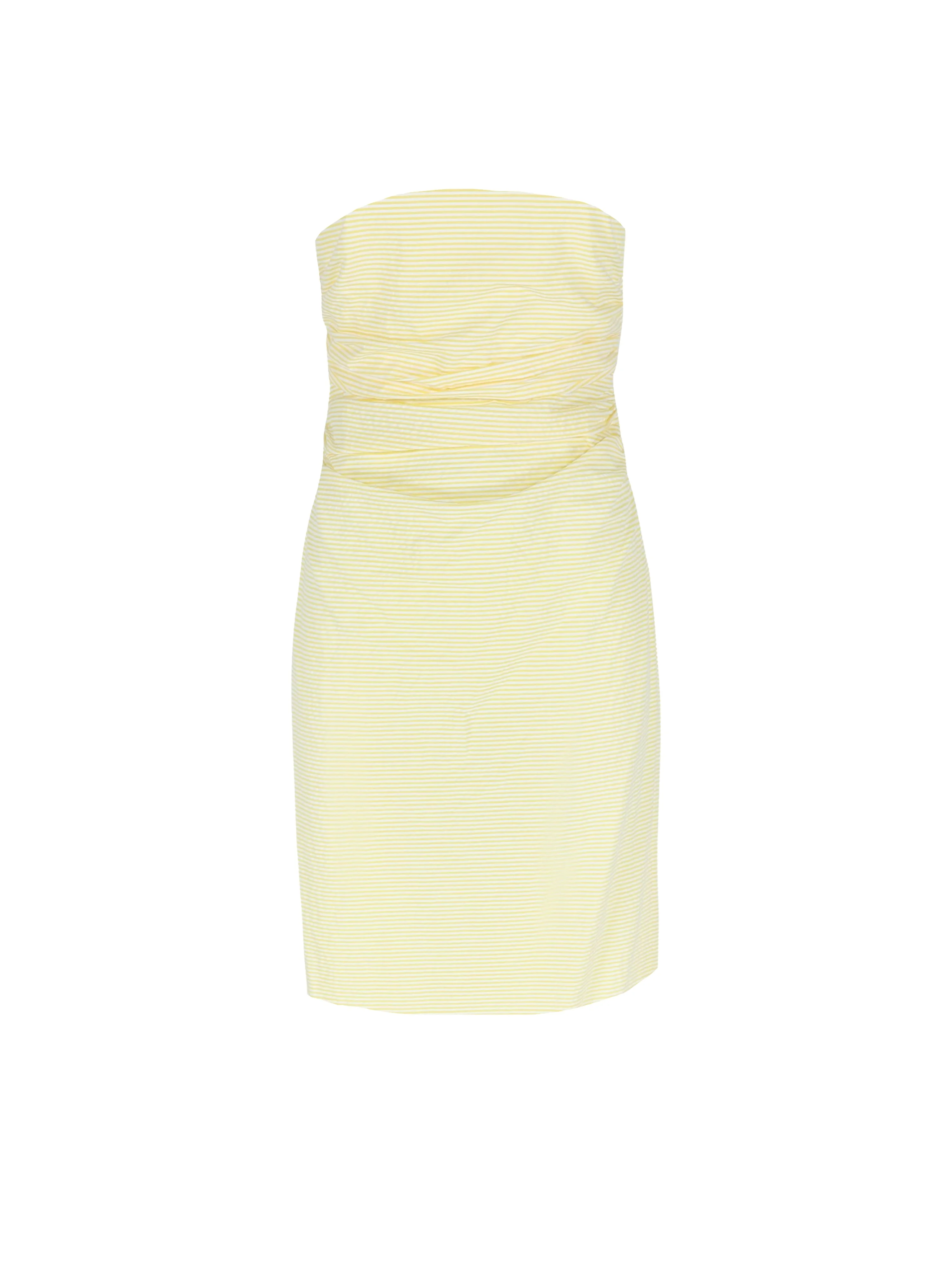 Short dress Vera — a bustier seersucker mini dress featuring white & yellow stripes. Designed with a subtly cinched waist and a flattering silhouette, it comes with a matching headscarf for the perfect warm-weather look. Product information Charlotte is 168cm / 5'6" and wears size EU34. Short Dress Vera is fully lined and fits true to size. For size inquiries, e-mail sales@bernadetteantwerp.com Fabrics from Portugal Made in Romania 100% CO