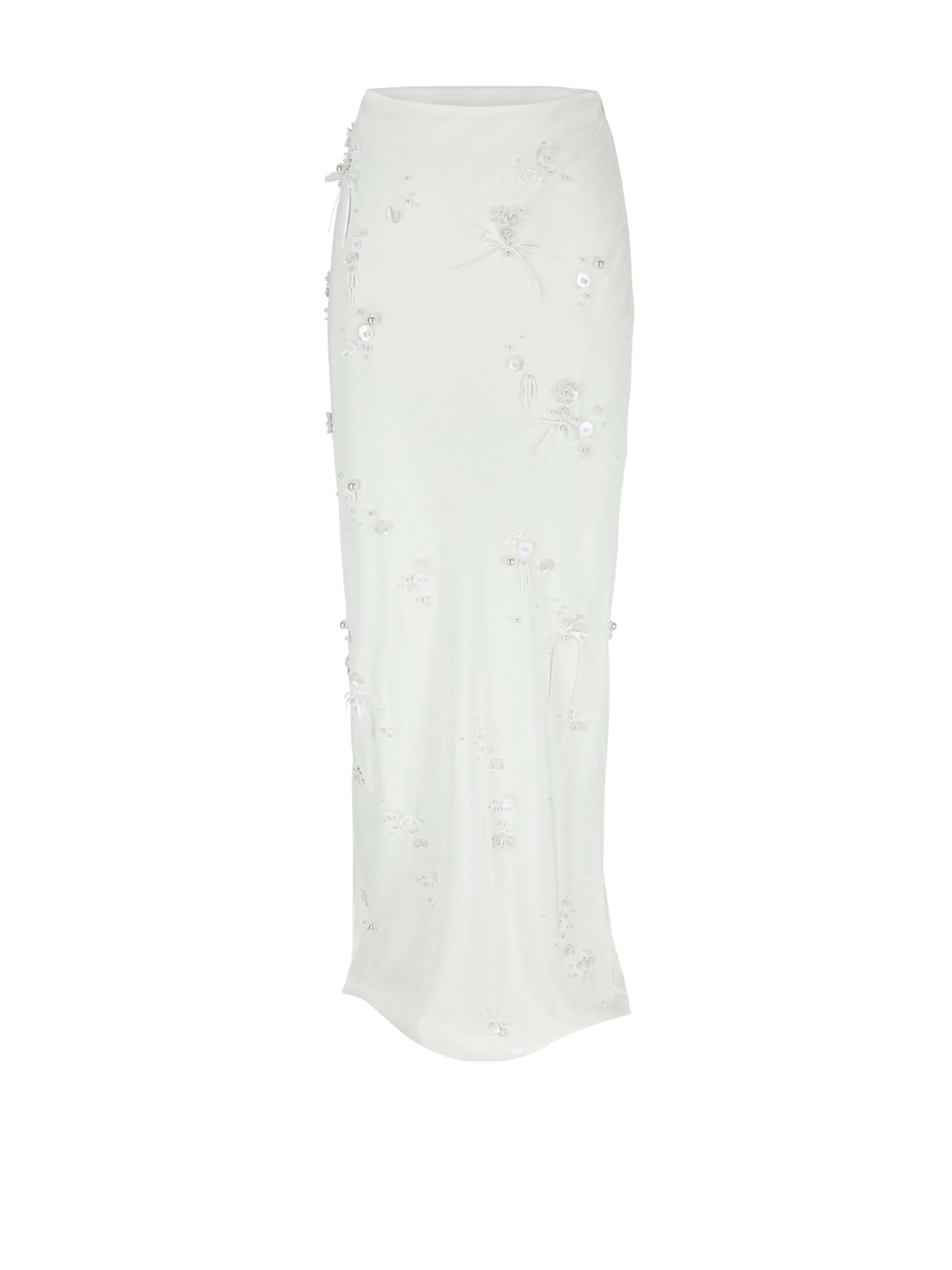 BERNADETTE proudly unveils its new Bridal Collection, featuring skirt Jolene, a fitted skirt embellished with pearl embroidery and necklace. This skirt will make a true impression on your big day. Product information Charlotte is 168 cm / 5'6" and wears size EU34. Skirt Jolene fits true to size. For size inquiries, e-mail sales@bernadetteantwerp.com. Made and hand-embroidered in India 100% SE / LINING: 100% VI