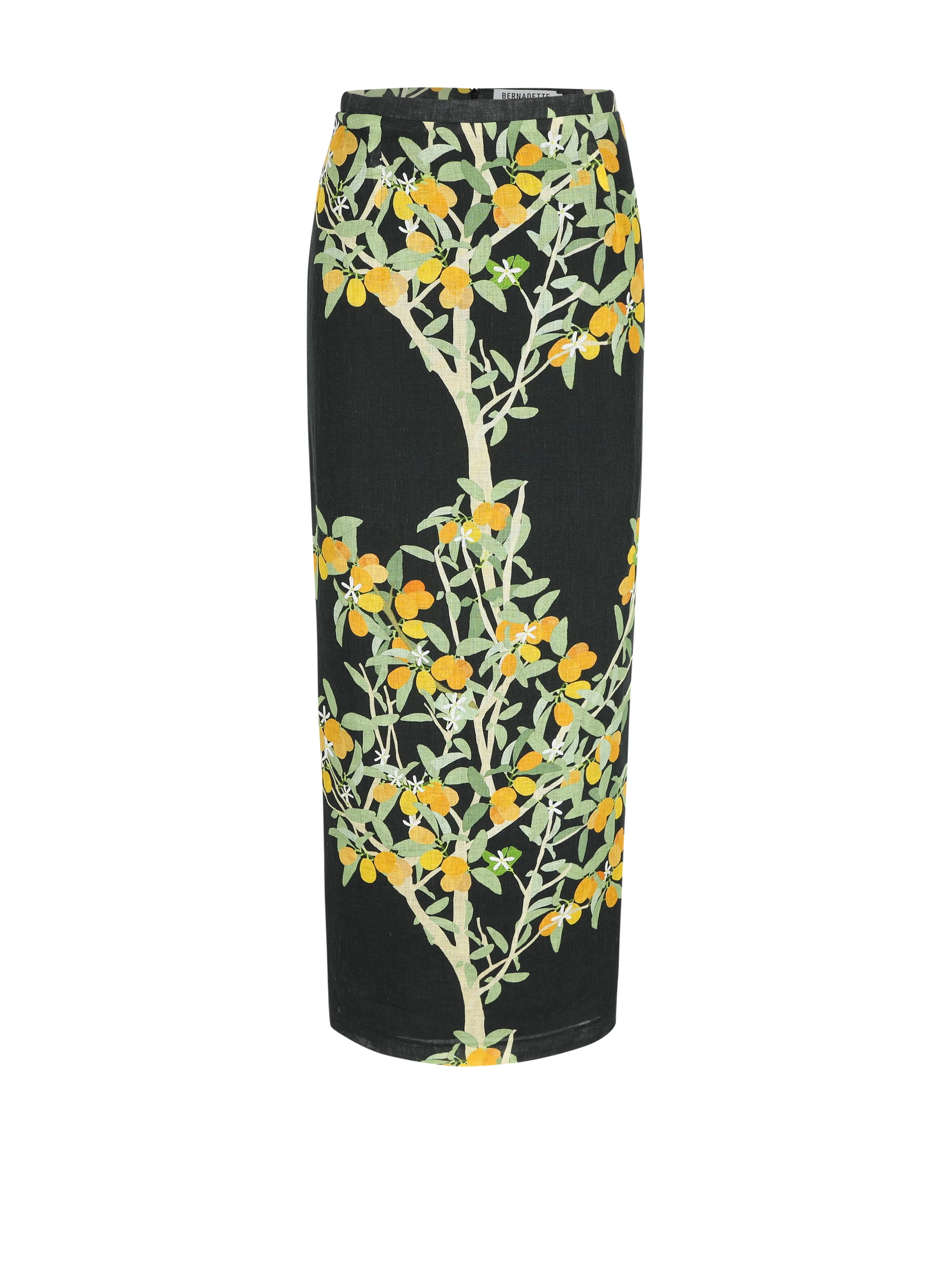 BERNADETTE's Norma skirt is making a comeback this summer! Cut from linen and printed with our kumquat drawing, the ankle-length pencil skirt is longing for tropical destinations and sunny beaches. The linen Norma skirt is paired with the Bowie top. Product information Charlotte is 168 cm / 5'6" and wears size EU34. Skirt Norma fits true to size. For size inquiries, please e-mail sales@bernadetteantwerp.com Fabrics from Italy Made in Romania 66% CO 34% LI