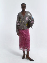 Cardigan Stormy is the knit to live in this season. A loose silhouette in soft beige, patterned with grey melange intarsia that traces weather cycles across its surface. Relaxed yet refined, it brings ease and poetry to everyday dressing—an effortless layer for shifting skies and changing days. Product information Charlotte is 168cm / 5'6" and wears size XS. Aster is 176 cm / 5’9” and wears size XS. Tumbush is 173 cm / 5’8” and wears size S. Cardigan Stormy is designed for an oversized fit. Take your usual size. For size inquiries, e-mail sales@bernadetteantwerp.com. Yarns from Italy Knitted in Romania 68% WP 10% WE 22% PA