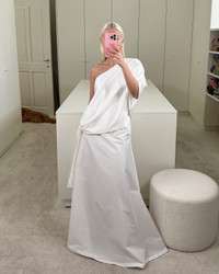 Introducing Top Eden in Ivory, part of BERNADETTE's 2025 Bridal Collection. Featuring a one-shoulder design and crafted from satin fabric, this top is a true staple with its knotted bow at the waist. Pair it with our Skirt Caswell for a complete bridal look. Product information Charlotte is 168 cm / 5'6" and wears size EU34. Mardiana is 174 cm / 5’9” and wears size EU36. Top Eden fits true to size. For size inquiries, e-mail sales@bernadetteantwerp.com. Fabrics from Greece Made in Romania 97% PL 3% SP