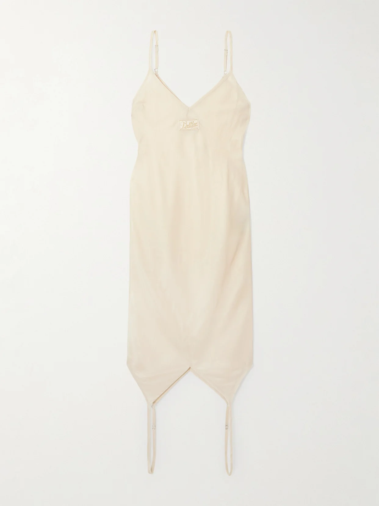 BETTTER's contemporary collections are filled with cool, unexpected details, like the neckline mirrored at the hem of this lingerie-inspired midi dress. It's made from semi-sheer deadstock satin-twill and appliqued with a logo tab at the chest.