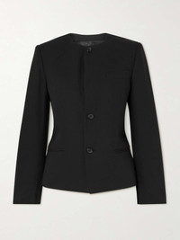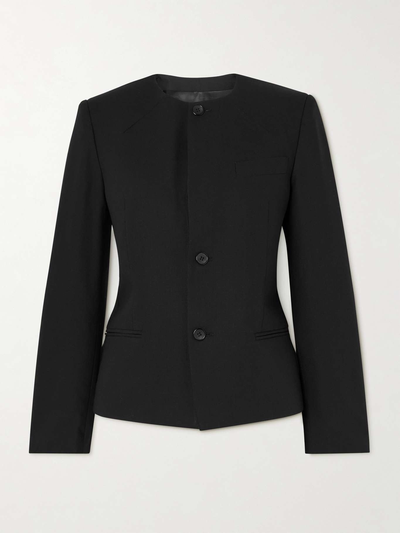 Former Vogue Ukraine Fashion Director Julie Pelipas describes BETTTER as not just a brand, but a platform to provide creatives with the tools and technologies to upcycle. Made from grain de poudre wool, this blazer is tailored in a gentle hourglass shape with structured shoulders and hip-length hem. Size & Fit - Fits true to size, however those who are between sizes should take the smaller size - Intended for a boxy fit, cut to be worn loose - Mid-weight, non-stretchy fabric - Model is 175cm/ 5'9" and is wearing a size XSmall Model measurements: - Bust: 81cm/ 32" - Waist: 64cm/ 25" - Hip: 89cm/ 35" Details & Care - Black grain de poudre wool - Partially concealed button fastenings through front - 100% wool; lining: 80% viscose, 20% polyester - Dry clean
