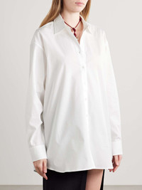 EDITORS'NOTES BETTTER turns vintage pieces into chic, contemporary designs - this classic collared shirt is upcycled from deadstock cotton-poplin that would otherwise be discarded. It has an oversized fit with dropped shoulders and a curved hem. Designed for Circularity. This product promotes lasting style and reduces waste by enhancing longevity, reuse or end-of-life solutions. Find out more about our NET SUSTAIN criteria here. SIZE & FIT Model measurements: - Intended to be oversized; we recommend sizing down if you prefer a closer - Dropped shoulder seam - Mid-weight, non-stretchy fabric - Model is 177cm/ 5'10" and is wearing a size Small - Bust: 79cm/ 31" - Waist: 61cm/ 24" - Hip: 88.9cm/ 35" DETAILS & CARE - White cotton-poplin - Button fastenings through front - 100% cotton - Green dry clean - Each BETTTER garment comes with a scannable Care Passport, which provides its fabric source and production history