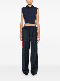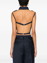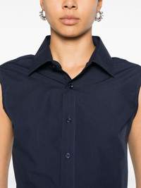 sleeveless open-back shirt Highlights - Navy blue - Cotton blend - Poplin texture - Classic collar - Adjustable spaghetti straps - Sleeveless - Cropped - Straight hem - Open back - Adjustable strap to the rear - Front button fastening Imported Composition Cotton 80%, Polyester 20% SIZE & FIT Model measurements Height 5 ft 9 in(1.76 m) Bust/Chest 31.88 in(81 cm) Hips 35.43 in(90 cm) Waist 24.8 in(63 cm) FittingInformation Designed for a slim fit that sits just away from the body offering a close yet comfortable fit The adjustable shoulder straps allow for a preferred fit when worn Made from a midweight non-stretch fabric This piece fits true to size – take your usual size