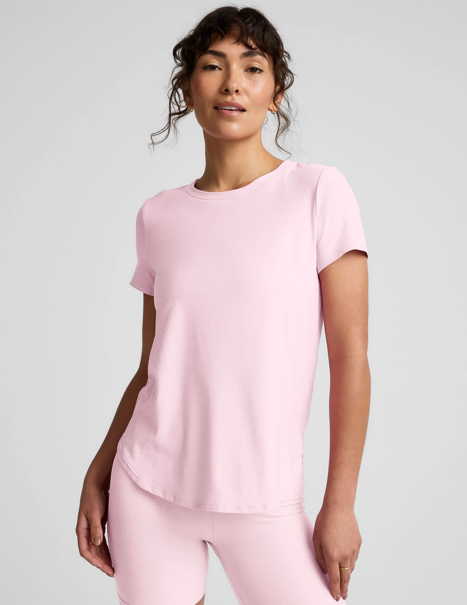 A relaxed fit tee made from our incredibly soft and lightweight, Featherweight Spacedye fabric. Complete with a curved hem, short sleeves, and long length for more coverage. Wear it with your favorite leggings or jeans for everyday style. - Relaxed fit - Short sleeves - Low hip length - Uniquely created to flatter every shape Fabric: Featherweight Spacedye SHOP ALL The lightweight version of our best-selling Spacedye fabric. Comprised of the same great hand and texture but light enough to wear as a layering piece without the compressive fit. 94% Polyester, 6% Spandex