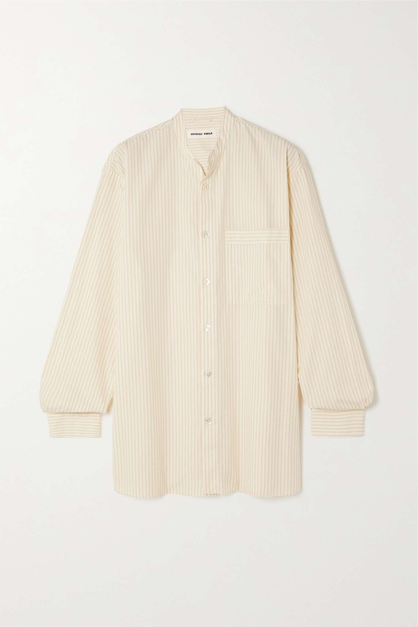 EDITORS'NOTES Birkenstock 1774 and TEKLA's collaboration is "made for moments of comfort." This pinstriped shirt is cut from organic cotton-voile that's a little kinder to people and the planet. The grandad collar and pleated back emphasize its relaxed feel. You can shop the matching shorts in our edit, too. SIZE & FIT - Fits true to size, take your normal size - Designed for a loose fit - Mid-weight, non-stretchy fabric - Model is 175cm/ 5'9" and is wearing a size XSmall DETAILS & CARE - Cream and orange organic cotton-voile - Button fastenings through front - 100% organic cotton - Machine wash - Designer color: Wheat Stripes