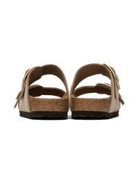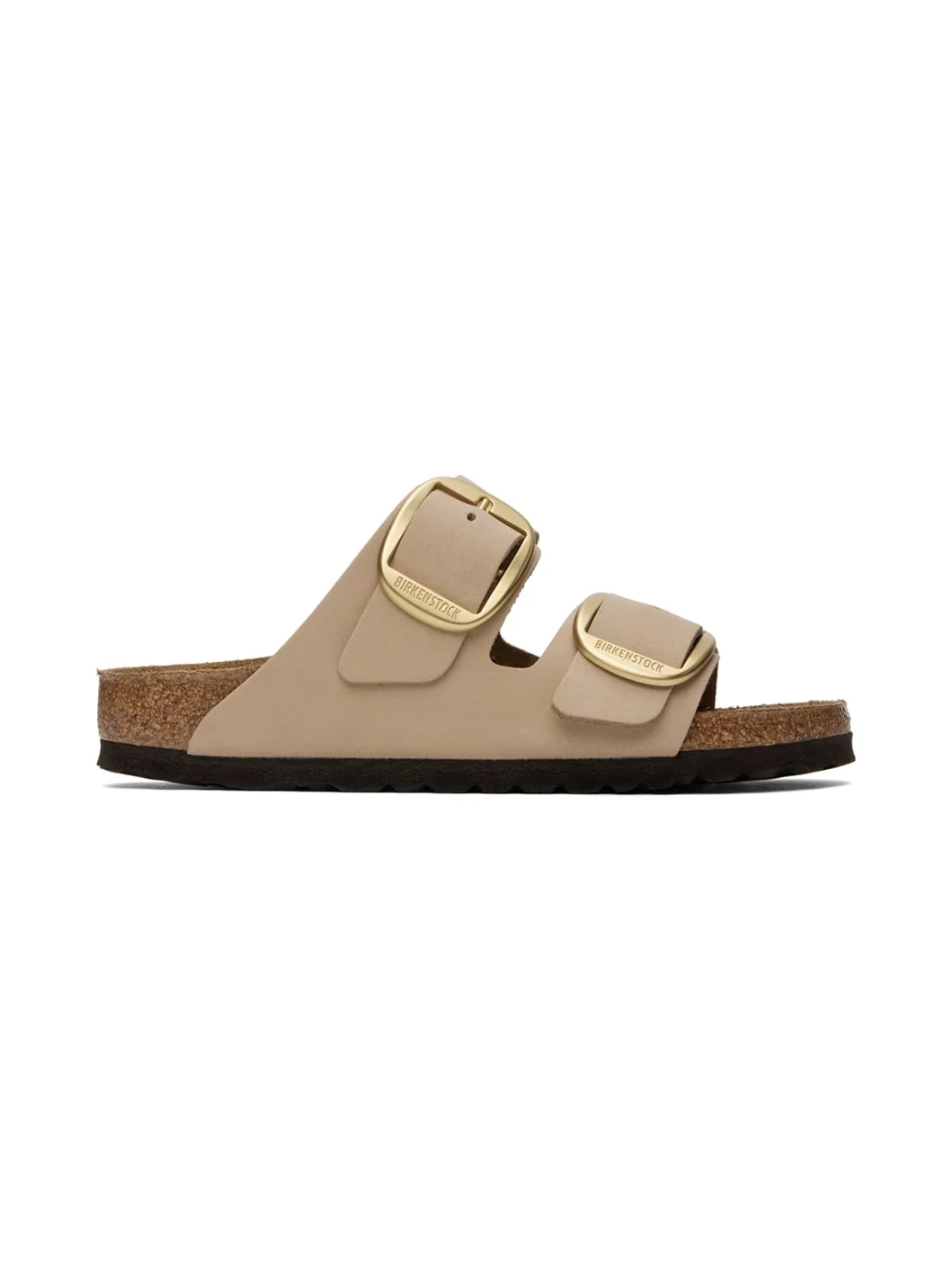 Nubuck slip-on sandals in taupe. · Open toe · Pin-buckle straps at vamp · Logo embossed at inner side · Logo stamp at molded suede footbed · Cork midsole · Treaded EVA rubber sole · Logo-engraved gold-tone hardware Supplier color: Sandcastle Upper: leather. Sole: cork, rubber. Made in Germany 242513F124024