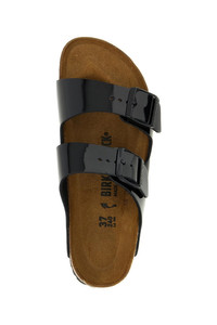 cod. 1005292BLACK 'Arizona BS' sandals in Birko-Flor® Patent fabric with trendy paint layer, adjustable tone-on-tone metal pin buckle straps, anatomical suede footbed, cork insole, EVA sole. Color: Black Size & Fit: EU UNISEX - narrow fit Composition: 100% birkoflor Made in: Germany