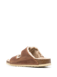 Arizona buckled leather sandals Highlights - Cognac brown - Calf leather/lambs wool - Logo-engraved buckle - Open toe - Slip-on style - Double buckle fastening - Branded insole - Rubber sole Imported Composition Lining: Lamb Fur 100% Sole: Rubber 100% Outer: Calf Leather 100% SIZE & FIT Measurement HEEL 1 in(2.5 cm) Sole height 0.6 in(1.5 cm)