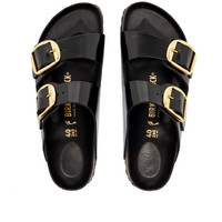 Birkenstock puts a chic spin on its classic Arizona sandal with this shiny black pair. The two strap uppers are crafted from natural leather with a glossy patent finish and feature oversized gold-tone buckles for a refined touch. The ever-present cork footbed continues to provide maximum support, complete with soft piumato leather lining for added comfort. - Natural Leather Uppers - Adjustable 2 Straps - Contoured Cork-Latex Footbed - EVA Sole Unit - Made in Germany