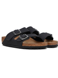 Buffed Birkibuc® faux-leather slip-on sandals in black. · Open toe · Pin-buckle straps at vamp · Logo embossed at inner side · Logo printed at molded footbed · Microfiber lining · Cork-latex midsole · Treaded rubber sole · Logo-engraved antiqued silver-tone hardware Supplier color: Black Upper: synthetic. Sole: rubber. Made in Germany 251513F124019