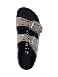 BIRKENSTOCK 'ARIZONA RIVET' STUDS SANDALS IN TAUPE SUEDE, ALL-OVER SILVER METAL STUDS, ROUND TOE, ADJUSTABLE TOP STRAPS, BUCKLE DETAIL WITH ENGRAVED LOGO, ANATOMICAL CORK AND LATEX FOOTBED, SLIP-ON FIT, RUBBER SOLE. PRODUCT INFO PRODUCT CODE 1027870TAUPE COMPOSITION: 100% LEATHER MADE IN: GERMANY - SOLE: 100% RUBBER