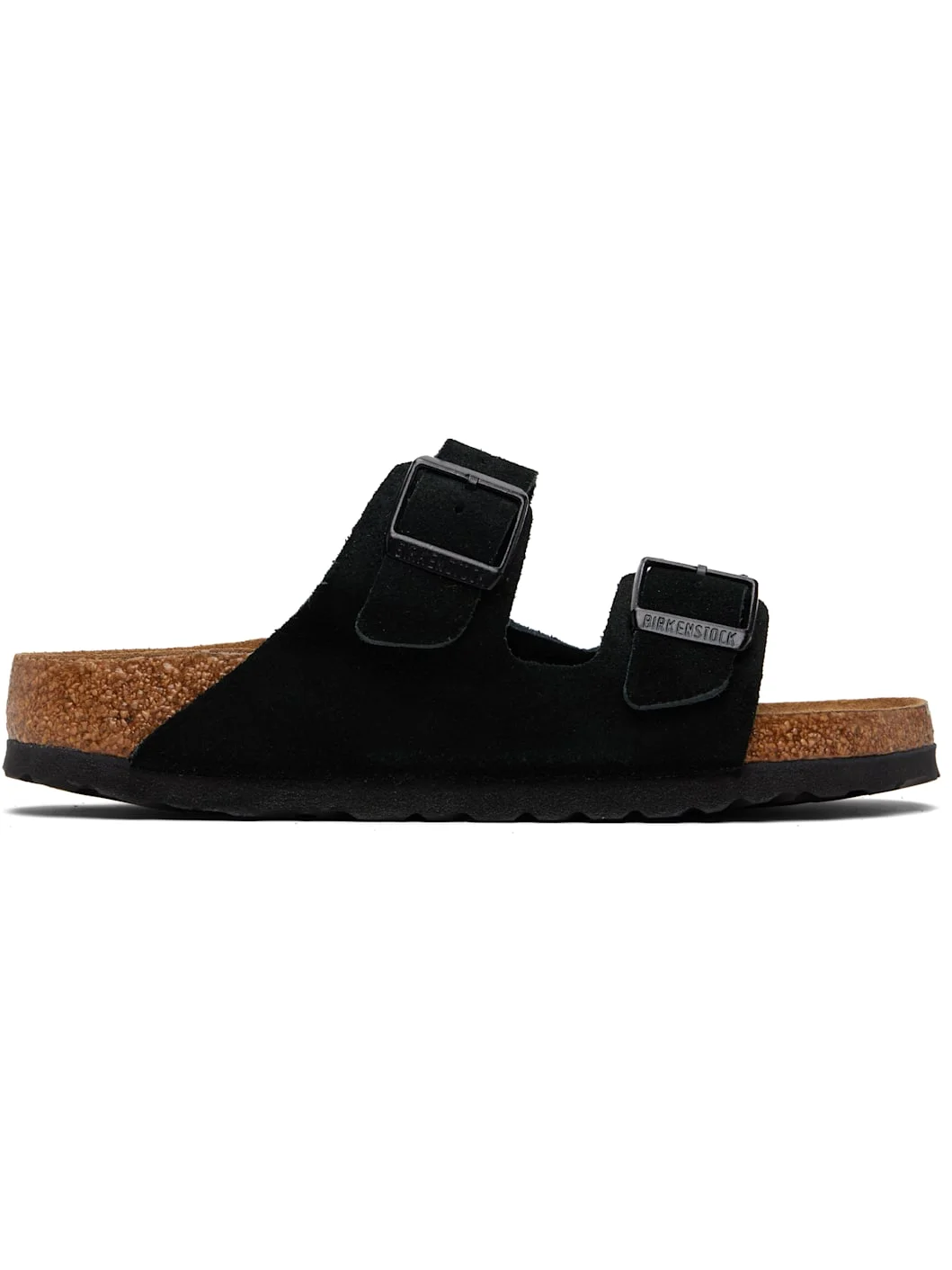 Suede flat sandals. · Open toe · Pin-buckle straps at vamp · Logo embossed at inner side · Logo printed at molded cushioned footbed · Cork-latex midsole · Treaded rubber sole Supplier color: Black Upper: leather. Sole: rubber. Made in Germany 261513F124053
