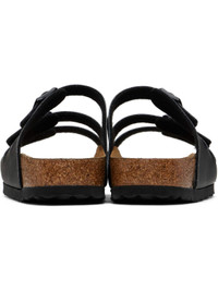 Buffed Birko-Flor® faux-leather slip-on flat sandals in black. · Open toe · Adjustable pin-buckle straps at vamp · Logo embossed at inner side · Cushioned molded suede footbed · Cork-latex midsole · Treaded foam rubber sole · Logo-engraved black hardware Supplier color: Black Upper: synthetic. Sole: rubber. Made in Germany 251513F124035