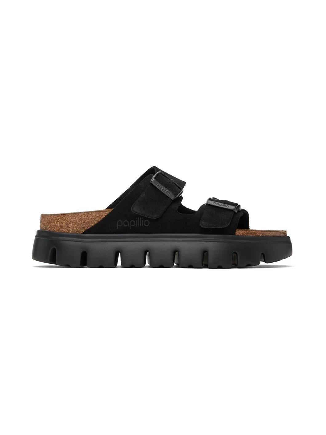 Suede slip-on sandals in black. · Open round toe · Adjustable pin-buckle straps at vamp · Logo embossed at outer side · Logo stamped at molded footbed · Latex-cork platform midsole · Treaded EVA foam rubber sole · Logo-engraved black hardware · Platform: H1" Part of the Papillio collection. Supplier color: Black Upper: leather. Sole: cork, rubber. Made in Portugal 242513F124019