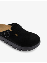 PRODUCT DETAILS - Birkenstock suede clogs - 100% suede - Slips on - Round closed-toe, buckle at side of foot, moulded foot bed, open heel, chunky tread style sole - Specialist leather clean - Made in Germany - Upper: 100% suede - Lining: 100% suede - Sole: 100% cork, 100% rubber Ref: R04347512