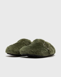 Birkenstock 1774 closes the year with festive styles. Building on the brand's heritage of impeccable savoir-faire and thoughtful design, the exclusive collection pays homage to the classics, where tradition meets modernity and absolute comfort takes center stage. A tribute to simplicity, the festive offering transforms the iconic Boston into a cozy essential with brushed shearling. For the first time, the model is dressed inside out, dipped in an elegant forest green and adorned with new, larger metal buckles in a gold finish. As usual, the style features Birkenstock's signature anatomical cork and latex footbed, lined with matching suede. Article Number: 1029943 Gender: Men, Women Color: GREEN Material: Upper material: 100% Synthetic/Textile