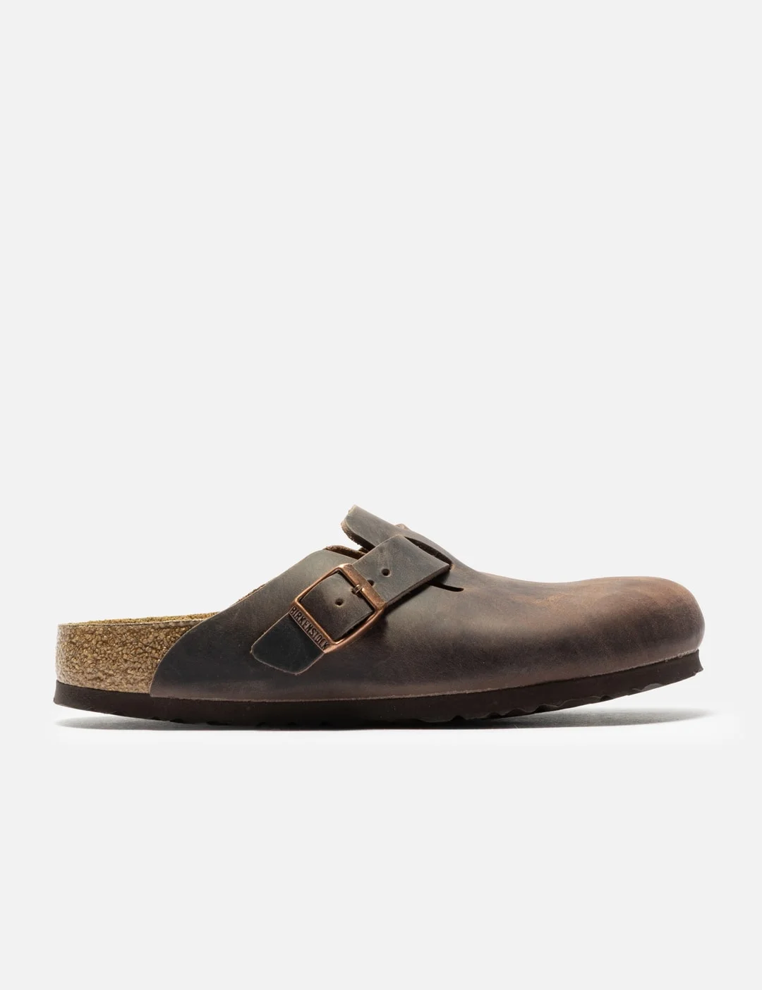 - Birkenstock - Boston Soft Footbed - Nature oiled leather upper - Adjustable strap with tonal metal buckle - Suede insole - Soft cork footbed with integrated latex foam cushion - EVA outsole - Made in Germany - Color: Habana - Material: Leather, Suede, Cork, EVA - See more Sandals and Shoes - Vendor Code: 159713
