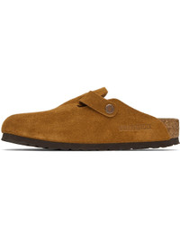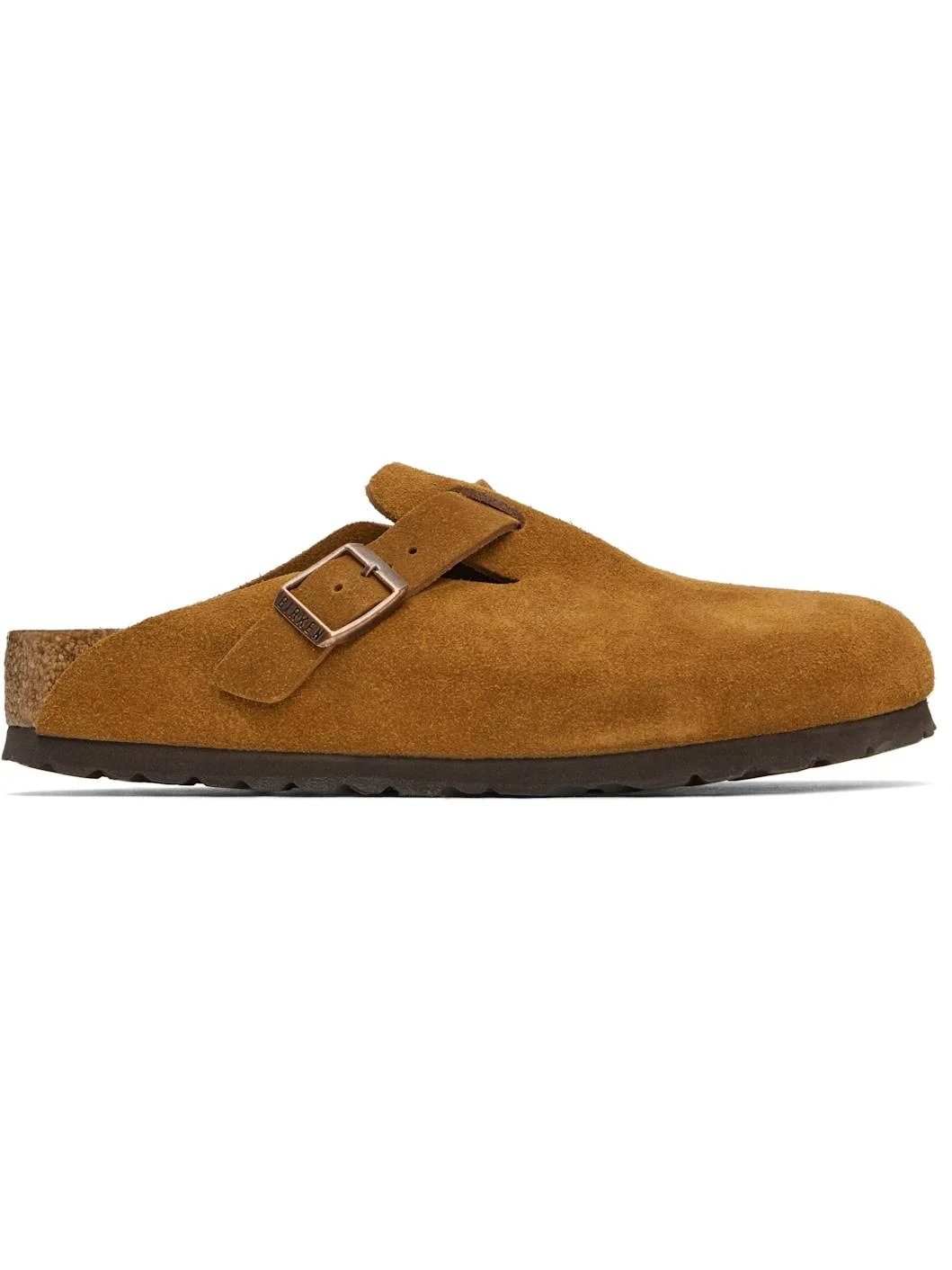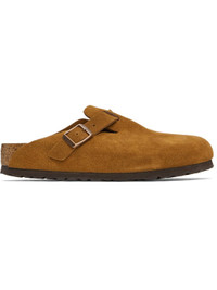 Suede slip-on loafers in tan. · Adjustable pin-buckle strap at vamp · Logo embossed at inner side · Logo stamp at molded suede footbed · Cork-latex midsole · Treaded rubber sole · Logo-engraved bronze-tone hardware Supplier color: Mink Upper: leather. Sole: cork, rubber. Made in Germany 251513F121011