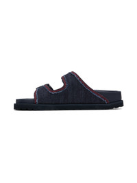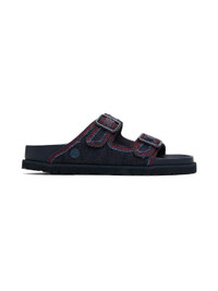Stone-washed denim slip-on flat sandals in navy. · Raw edges throughout · Open toe · Pin-buckle straps at vamp · Logo hardware at outer side · Logo stamp at leather-covered cork-latex molded footbed · Suede lining · Treaded EVA rubber sole · Contrast stitching in red Part of the 1774 collection. Supplier color: Dark wash denim Upper: textile. Sole: ethinyl vinyl acetate. Made in Germany 242513F124059