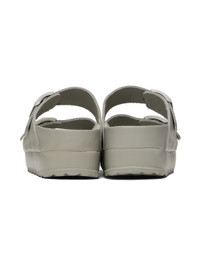 Buffed leather slip-on flat sandals in gray. · Open toe · Adjustable pin-buckle straps at vamp · Logo embossed at outer sides · Logo stamp at cork molded footbed · EVA foam rubber platform midsole · Treaded EVA foam rubber sole · Tonal logo-engraved hardware · Platform: H1" Part of the Papillio collection. Supplier color: Mineral gray Upper: leather. Sole: cork, rubber. Made in Portugal 241513F124026