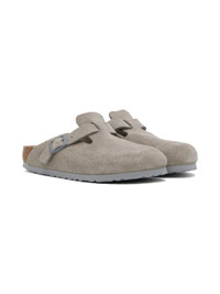 Suede slip-on loafers in gray. · Pin-buckle strap at vamp · Logo embossed at inner side · Logo printed at molded cushioned footbed · Latex-cork midsole · Treaded EVA rubber outsole · Logo-engraved antiqued copper-tone hardware Supplier color: Stone coin