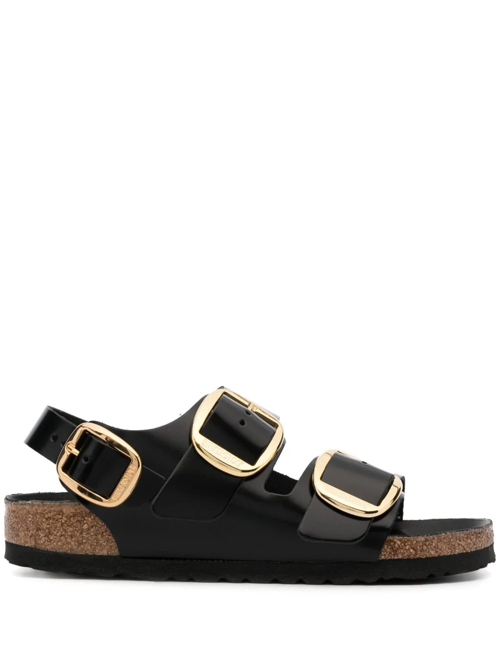 Milano leather flat sandals Highlights - Black - Calf leather - High-shine finish - Logo-engraved buckle - Open toe - Round toe - Gold-tone buckle fastening - Branded insole - Flat rubber sole Imported Composition Leather 100%