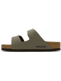 Grained Birkibuc® faux-leather slip-on flat sandals in taupe. · Open toe · Adjustable pin-buckle straps at vamp · Logo embossed at inner side · Logo stamp at molded suede footbed · Latex-cork midsole · Treaded foam rubber sole · Logo-engraved copper-tone hardware Supplier color: Stone Upper: synthetic. Sole: rubber. Made in Germany 251513F124029