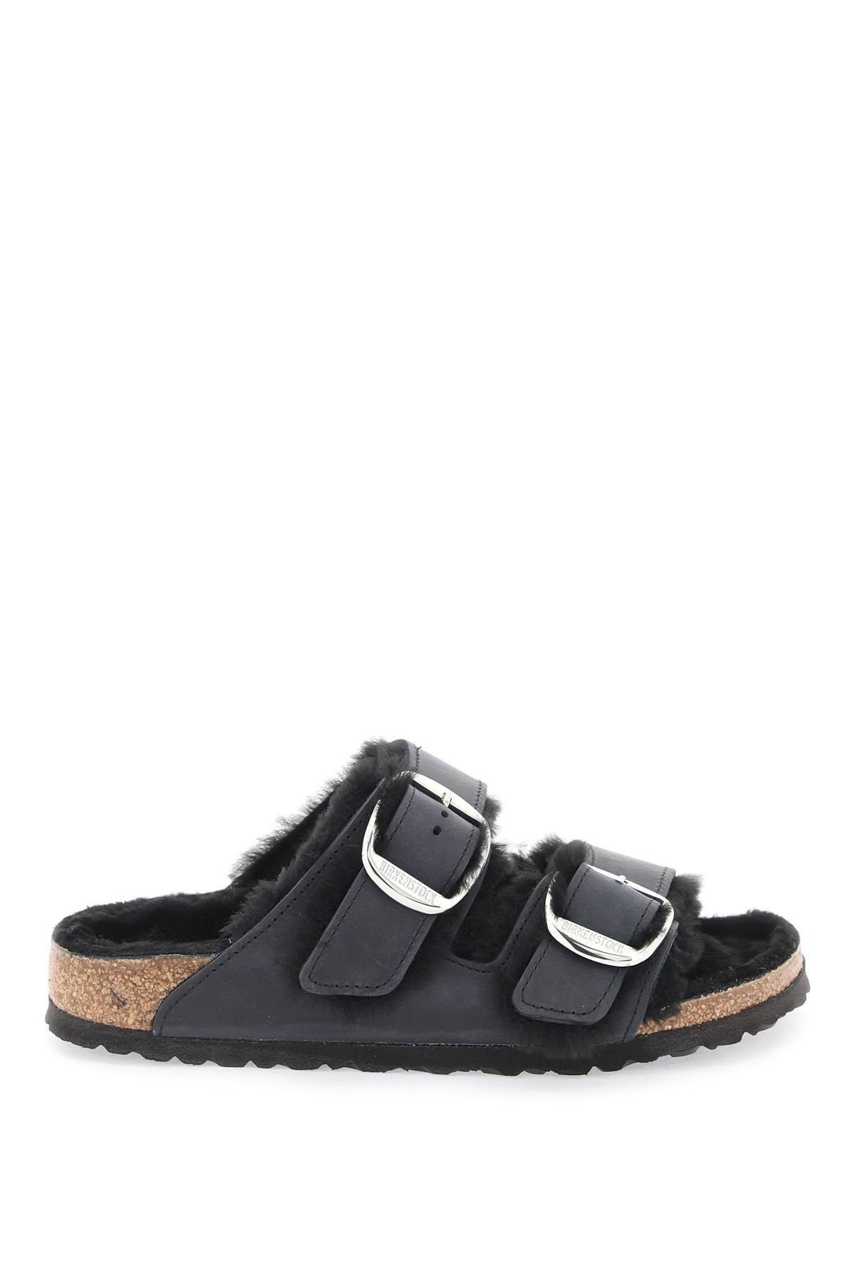 BIRKENSTOCK Arizona slides crafted in teddy lamb fur featuring double adjustable oiled leather strap with oversize silver metal buckle with debossed logo. Fur footbed, moulded cork and latex sole and EVA tread. PRODUCT DETAILS Made In: Germania Composizione: 100% shearling, 100% leather Heel Height: 3 cm Sole: Rubber Supplier Color Code: BLACK Supplier Code: 1020138 FTA: No Season: SS24