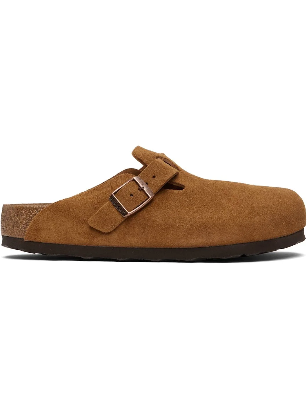 Suede slip-on loafers. · Pin-buckle strap at vamp · Logo embossed at inner side · Logo printed at molded cushioned footbed · Cork-latex midsole · Treaded rubber sole Supplier color: Mink Upper: leather. Sole: rubber. Made in Germany 261513F121030