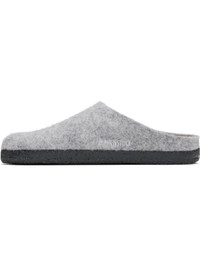 Wool melton slippers in gray. · Logo rivet at vamp · Pinched seam at outer side · Logo embroidered at inner side · Removable molded suede and cork footbed · Suede lining · Treaded rubber sole Supplier color: Light grey taupe Upper: textile. Sole: rubber. Made in Italy 251513F121029