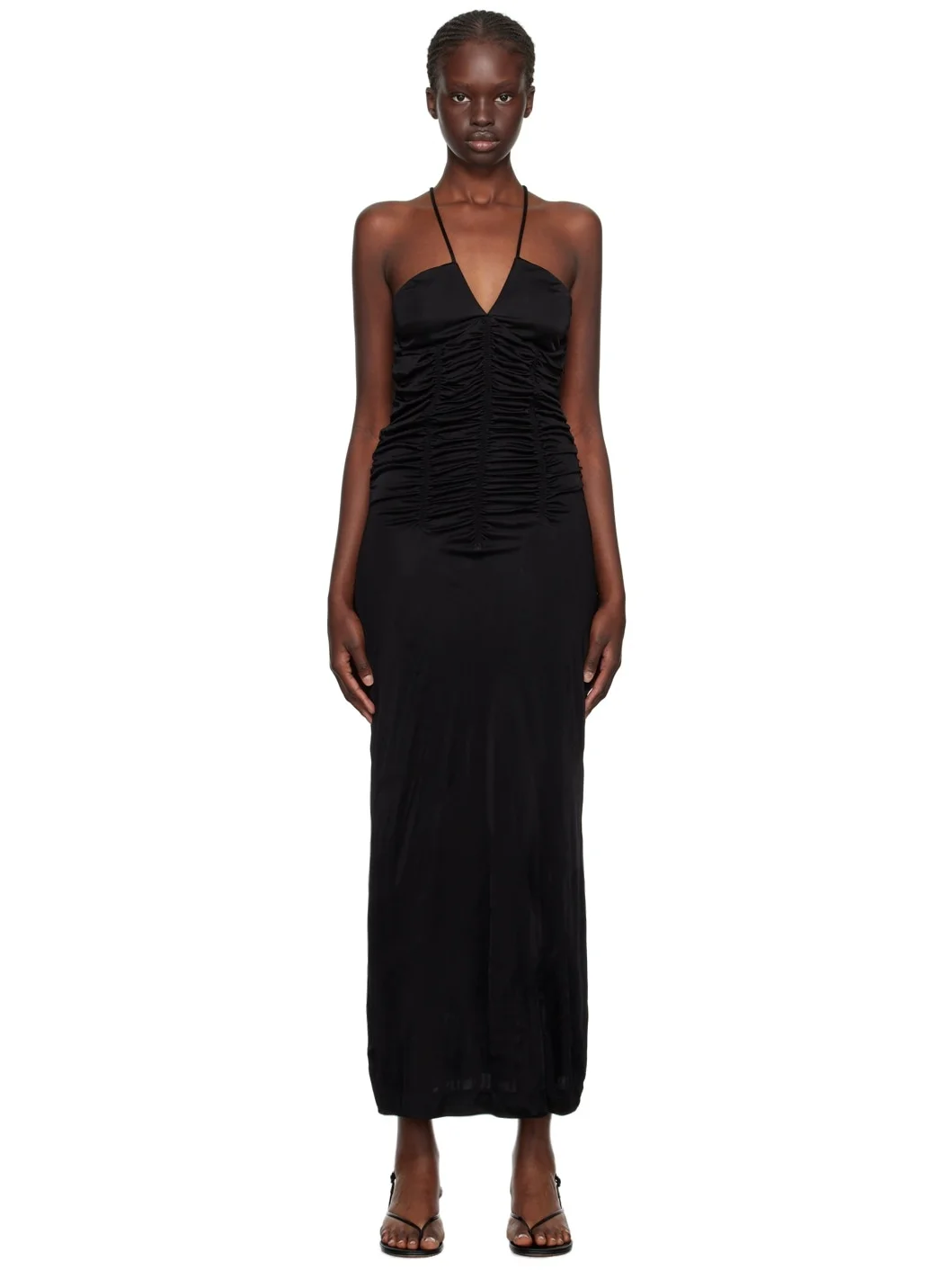 Viscose jersey dress. Ruching throughout. · V-neck · Fixed spaghetti straps · Fully lined Supplier color: Black 100% viscose. Made in Portugal 232734F055002